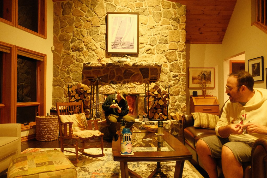 Nestled along the stunning Niagara Escarpment that stretches from the shores of Georgian Bay lies a serene enclave of rolling hills and pristine lakes basking in the subtle shadow of the Blue Mountains. A Bladee track plays loudly in the background, a fire crackles, hands meticulously shuffle a deck of cards, beers are cracked open; glasses emptied, glasses filled. When you go skiing in Ontario, the skiing is only twenty percent.